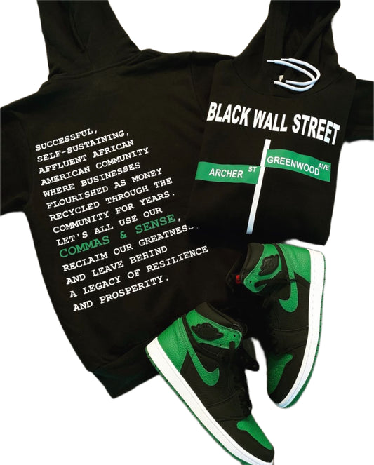 BLACK WALL STREET HOODIE (WITH DESCRIPTION ON BACK)